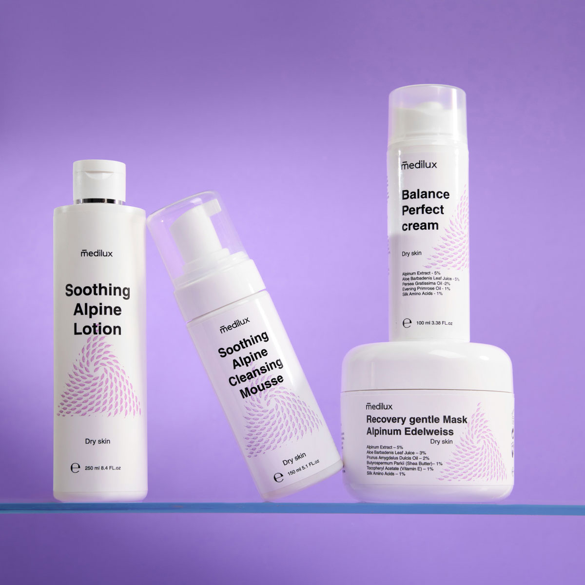 At Medilux, we incorporate edelweiss extract into our skincare line for dry, sensitive, and mature skin. Our Alpinum Edelweiss line includes a cleansing gel, toner, and more — all designed to preserve youthful skin. (insert active link)